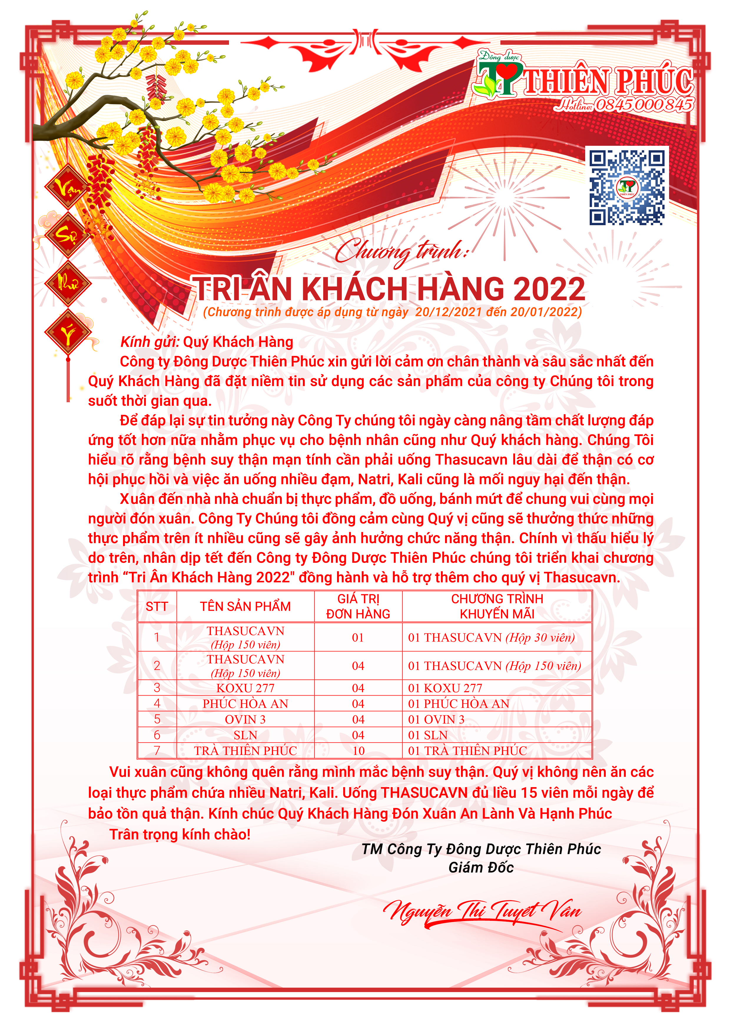 Nhân dịp chào đón năm mới xuân Nhâm Dần 2022. Công ty Đông Dược Thiên Phúc kính chúc quý khách hàng nhiều SỨC KHỎE, HẠNH PHÚC, MAY MẮN VÀ THÀNH CÔNG. Công Ty Đông Dược Thiên Phúc xin gửi đến Quý khách hàng chương trình khuyến mãi “Tri Ân Khách Hàng Đón Xuân 2022”. Hy vọng trong năm 2022 Thiên Phúc sẽ luôn tiếp tục nhận được sự tin tưởng và ủng hộ của quý khách hàng trong thời gian tới.
