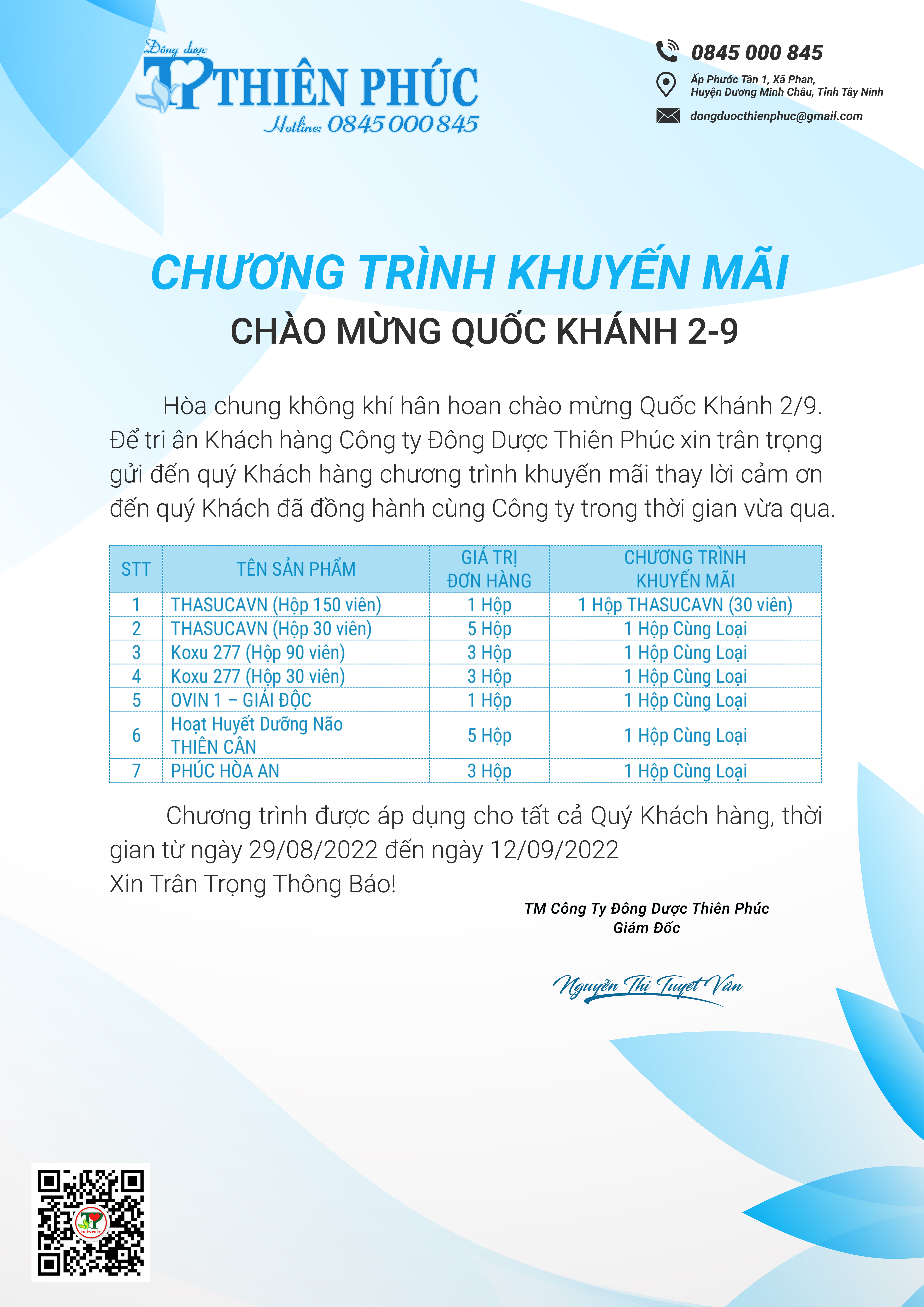 Nhằm mang tới cho Quý khách hàng những ưu đãi hấp dẫn nhân dịp Lễ Quốc khánh 2/9. Công ty Đông Dược Thiên Phúc xin trân trọng gửi đến Quý khách hàng chương trình khuyến mãi thay lời Cảm ơn Quý khách đã đồng hành cùng Công ty trong thời gian vừa qua!